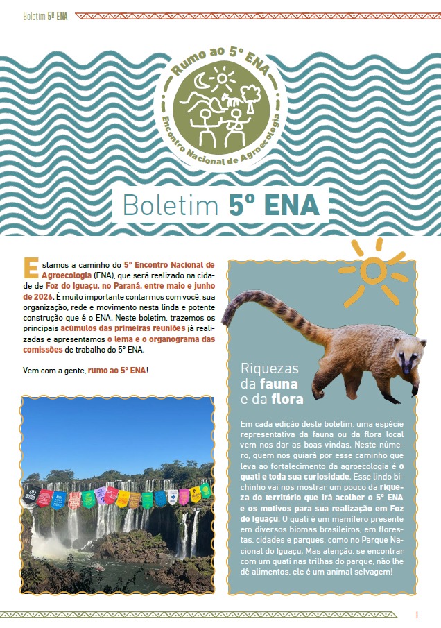O Encontro Nacional de Agroecologia (ENA) é um processo potente de mobilização e articulação do movimento agroecológico em todo o Brasil. Neste Boletim 5º ENA – Nº 1, publicado em setembro de 2025, trazemos os resultados das primeiras reuniões realizadas e apresentamos o lema do Encontro e o organograma das comissões de trabalho. A quinta edição do ENA vai ser realizada na cidade de Foz do Iguaçu (PR) e é muito importante contarmos com você, sua organização, rede e movimento nesta linda construção.